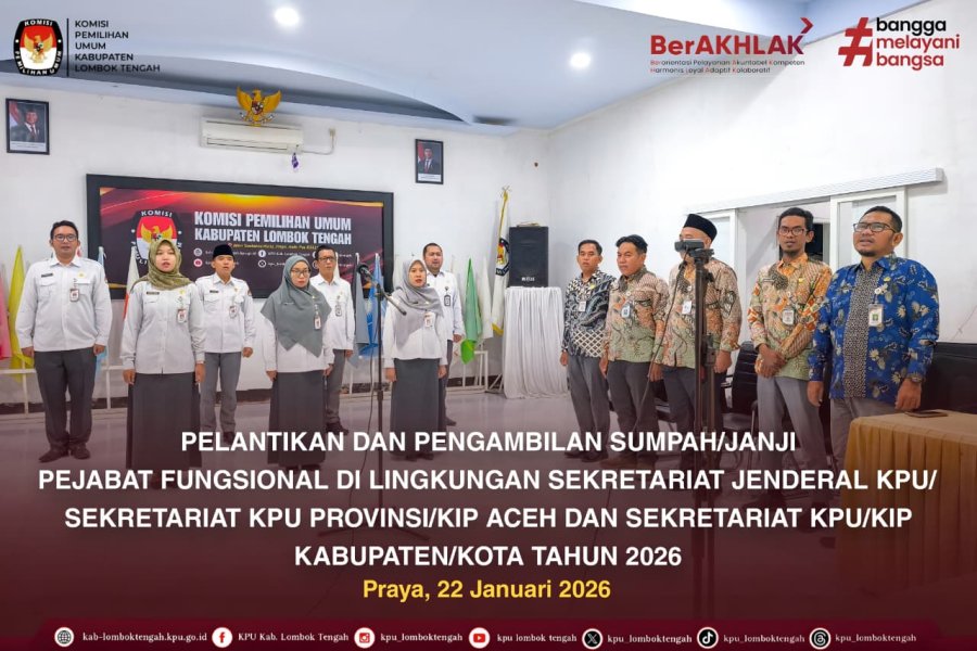 #TemanPemilih Kamis (22/1/2026) Sebanyak 7 (tujuh) orang pegawai di lingkungan Sekretariat KPU Kabupaten Lombok Tengah resmi dilantik dan diambil sumpah/janji sebagai Pejabat Fungsional Penata Kelola Pemilihan Umum. Pelantikan tersebut merupakan bagian dari Pelantikan dan Pengambilan Sumpah/Janji Pejabat Fungsional Penata Kelola Pemilihan Umum di lingkungan Sekretariat Jenderal KPU, Sekretariat KPU Provinsi/KIP Aceh, serta Sekretariat KPU/KIP Kabupaten/Kota Tahun 2026, yang dilaksanakan secara daring melalui Zoom Meeting dan diikuti dari Aula kantor KPU Kabupaten Lombok Tengah. Prosesi pengambilan sumpah/janji pejabat fungsional dipimpin langsung oleh Sekretaris Jenderal KPU RI, Bernad Dermawan Sutrino, sementara Ketua KPU RI, Mochammad Afifuddin, menyampaikan arahan kepada seluruh pejabat fungsional yang dilantik. Di lingkungan KPU Kabupaten Lombok Tengah, kegiatan tersebut turut dihadiri oleh Sekretaris Kabupaten Lombok Tengah dan para Kepala Sub Bagian di lingkungan KPU Kabupaten Lombok Tengah. Pelantikan ini merupakan wujud komitmen Komisi Pemilihan Umum dalam memperkuat tata kelola organisasi melalui pembentukan aparatur yang profesional, kompeten, dan berintegritas, guna mendukung peningkatan kualitas penyelenggaraan pemilu dan pemilihan di Indonesia. Diharapkan para pejabat yang dilantik dapat menjalankan amanah dengan penuh tanggung jawab serta berkontribusi aktif dalam mewujudkan pemilu dan pemilihan yang bersih, transparan, dan akuntabel. #KPUMelayani #KPULoteng ....