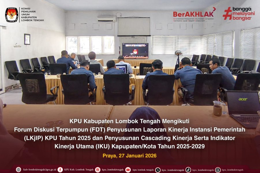 #TemanPemilih Selasa (27/01/2026) KPU Kabupaten Lombok Tengah mengikuti Forum Diskusi Terpumpun (FDT) Penyusunan Laporan Kinerja Instansi Pemerintah (LKjIP) KPU Tahun 2025 dan Penyusunan Cascading Kinerja serta Indikator Kinerja Utama (IKU) Kabupaten/Kota Tahun 2025-2029. Kegiatan ini diselenggarakan oleh KPU RI secara daring melalui Zoom Meeting, dihadiri oleh Ketua dan Anggota KPU Kabupaten Lombok Tengah, Sekretaris, Kasubbag, serta Pejabat Fungsional bertempat di aula kantor KPU Kabupaten Lombok Tengah. FDT ini diikuti oleh seluruh satuan kerja KPU se-Indonesia yang bertujuan untuk menyamakan pemahaman terkait penyusunan LKjIP yang akuntabel dan sesuai dengan perencanaan kinerja, serta penyusunan Cascading IKU sebagai alat ukur keberhasilan pelaksanaan tugas dan fungsi KPU. Melalui kegiatan ini diharapkan perencanaan dan pelaporan kinerja KPU Kabupaten Lombok Tengah dapat disusun dengan lebih terarah dan akuntabel, sehingga mendukung peningkatan kinerja dan tata kelola lembaga yang lebih baik. #KPUMelayani #KPULoteng ....