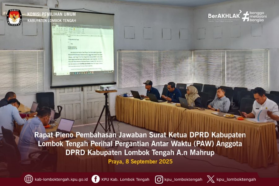 Senin (08/09/2025) Bertempat di aula kantor KPU Kab. Lombok Tengah dilaksanakan Rapat Pleno pembahasan jawaban surat Ketua DPRD Kab. Lombok Tengah perihal Permintaan Nama Calon Pengganti Antar Waktu Anggota DPRD Kab. Lombok Tengah sisa masa jabatan 2024 - 2029.