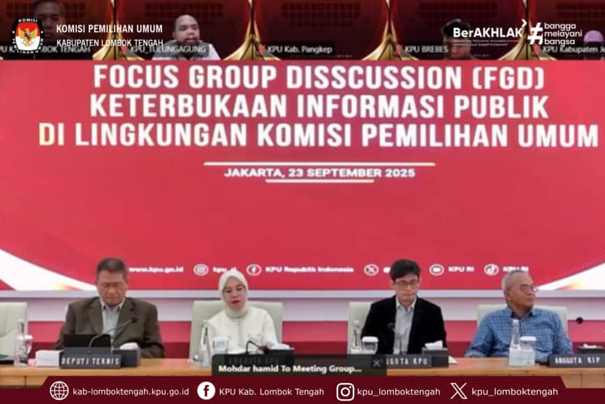 Selasa (23/09/2025) KPU Kabupaten Lombok Tengah menghadiri kegiatan Focus Group Discussion (FGD) Keterbukaan Informasi Publik di lingkungan KPU secara daring melalui zoom meeting.