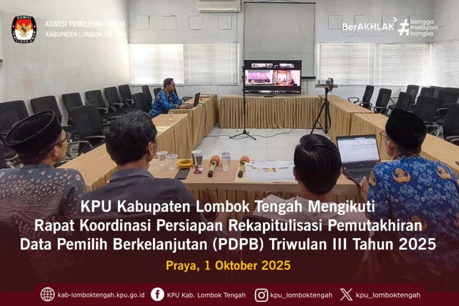 KPU Kabupaten Lombok Tengah menghadiri Rapat Koordinasi Persiapan Rekapitulasi Pemutakhiran Data Pemilih Berkelanjutan (PDPB) Triwulan III Tahun 2025 yang diselenggarakan oleh KPU Provinsi NTB secara daring melalui zoom meeting. Rabu (1/10/2025)