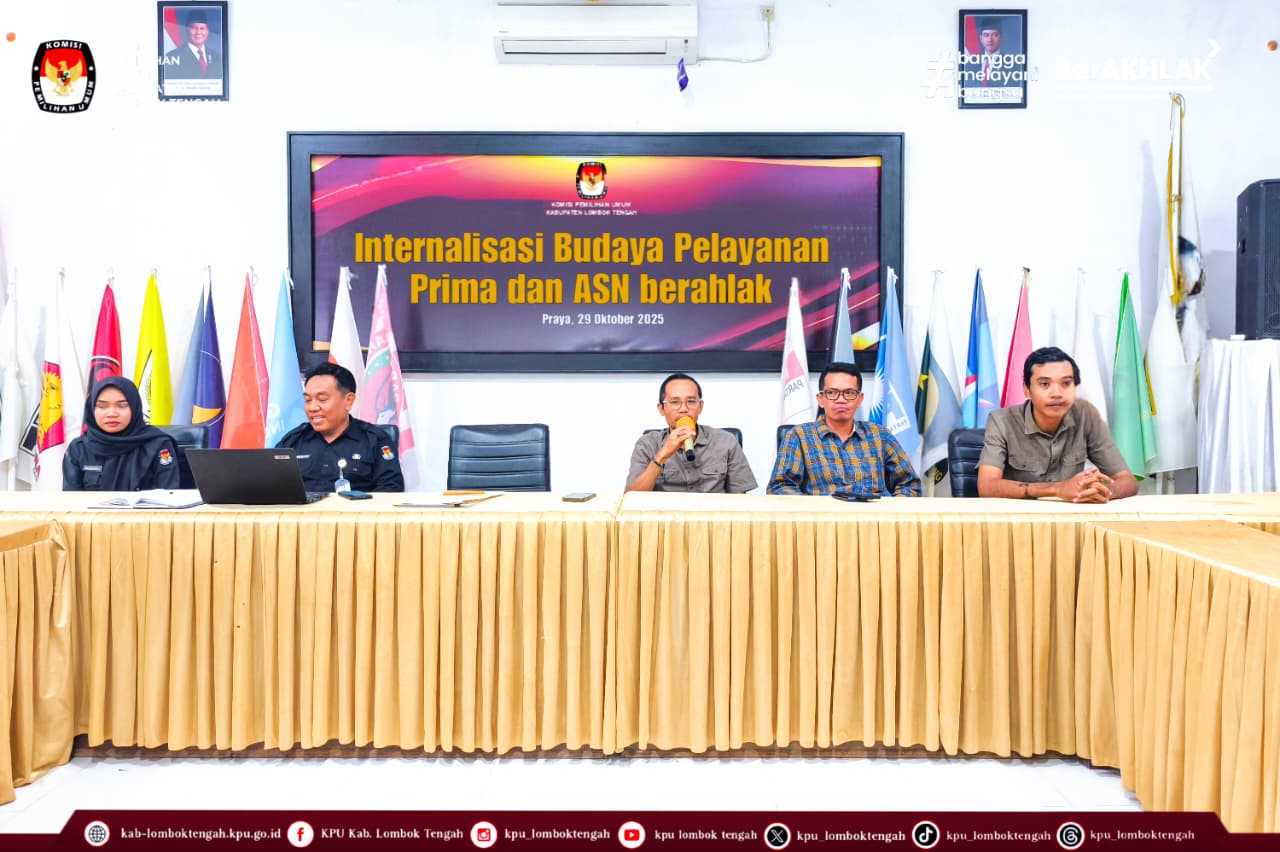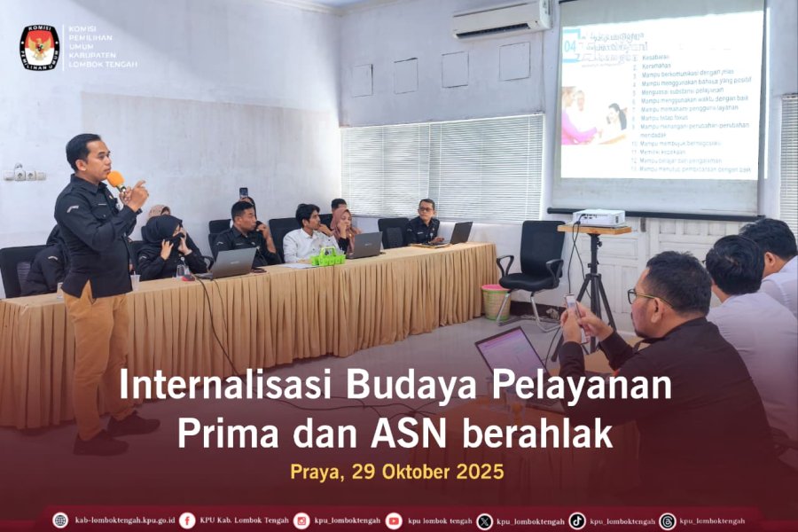 KPU Kabupaten Lombok Tengah menggelar Sosialisasi internal Membangun Budaya Pelayanan Prima dan ASN berAKHLAK, serta sharing knowledge memgenai Kapasitas Keprotokolan. Rabu (29/10/2025).