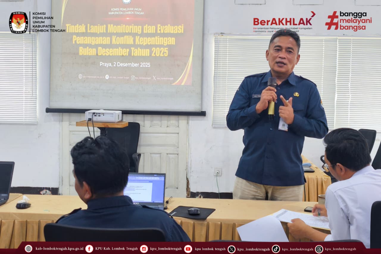 Selasa (02/12/2025), KPU Kabupaten Lombok Tengah melaksanakan Rapat Tindak Lanjut Hasil Monitoring dan Evaluasi (Monev) Penanganan Benturan Kepentingan Bulan Desember 2025 sebagai bagian dari upaya memperkuat tata kelola lembaga yang berintegritas.