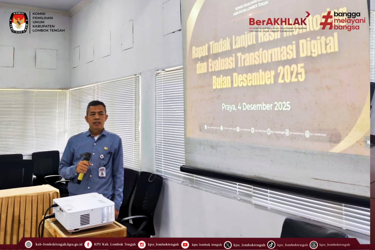 Sebagai langkah tindaklanjut hasil Monev, KPU Kabupaten Lombok Tengah menggelar Rapat Tindak Lanjut Hasil Monitoring dan Evaluasi (Monev) Transformasi Digital Bulan Desember 2025, bertempat di aula rapat KPU Kabupaten Lombok Tengah pada Kamis (04/12/2025).