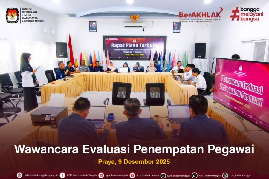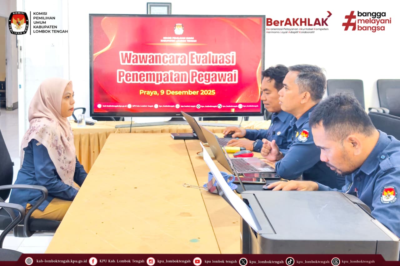 Selasa (09/12/2025), KPU Kabupaten Lombok Tengah melaksanakan kegiatan wawancara evaluasi penempatan pegawai yang berlangsung di aula rapat KPU Kabupaten Lombok Tengah.