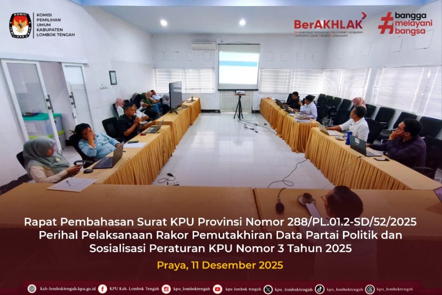 Kamis (11/12/2025), KPU Kabupaten Lombok Tengah melaksanakan Rapat Pembahasan Surat KPU Provinsi NTB Nomor 288/PL.01.2-SD/52/2025 perihal Pelaksanaan Rakor Pemutakhiran Data Partai Politik dan Sosialisasi Peraturan KPU Nomor 3 Tahun 2025.
