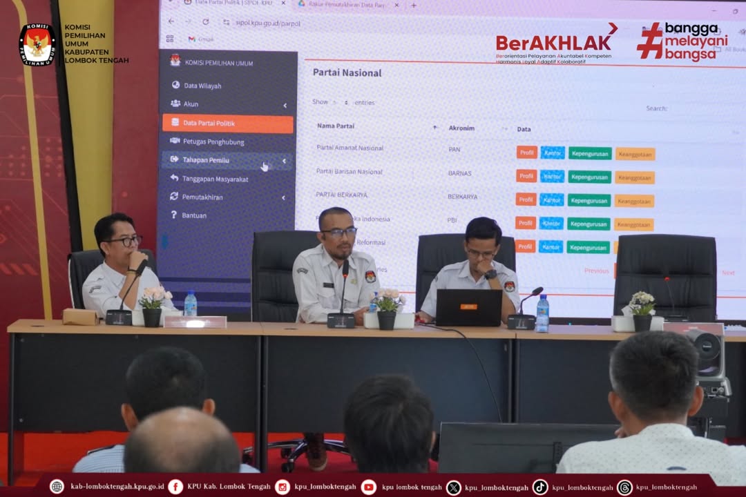 Senin (15/12/2025) KPU Kabupaten Lombok Tengah menghadiri Rapat Koordinasi Pemutakhiran Data Partai Politik Berkelanjutan melalui Aplikasi Sistem Informasi Partai Politik (SIPOL) yang diselenggarakan oleh KPU Provinsi NTB, bertempat di Ruang Rapat Gedung B kantor KPU Provinsi NTB.