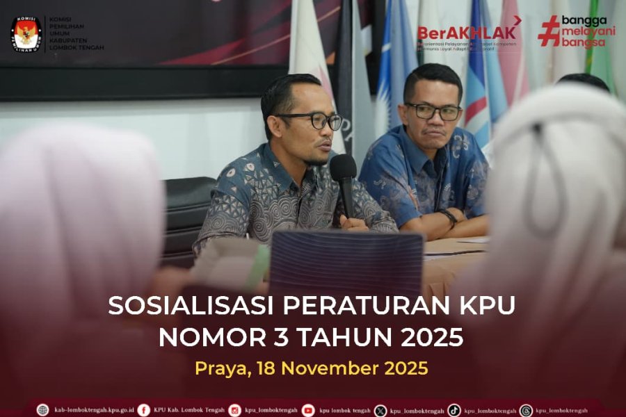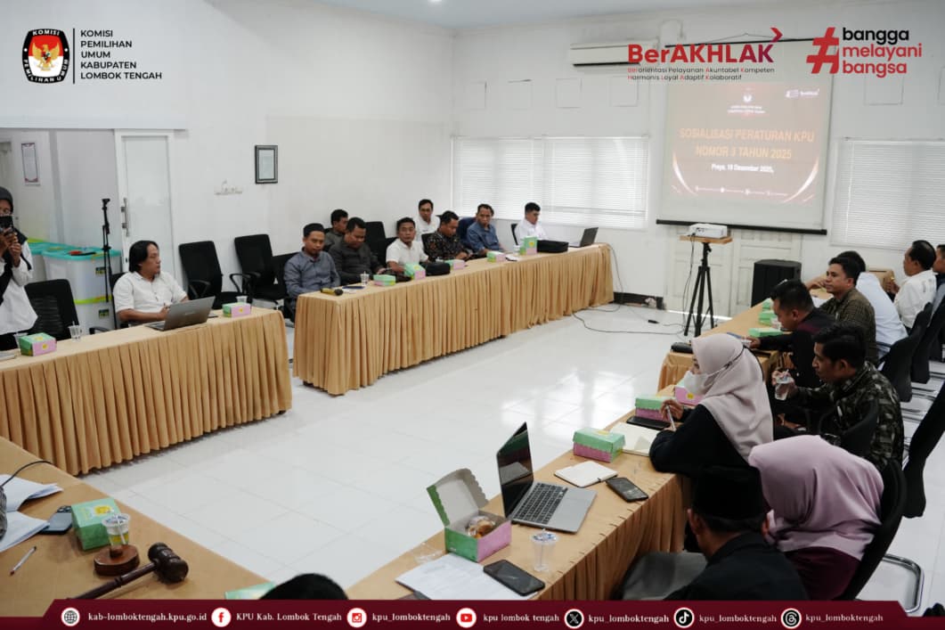 Kamis (18/12/2025) KPU Kabupaten Lombok Tengah menyelenggarakan Sosialisasi Peraturan KPU Nomor 3 Tahun 2025 tentang Penggantian Antarwaktu (PAW) Anggota DPR, DPD, DPRD Provinsi, dan DPRD Kabupaten/Kota.