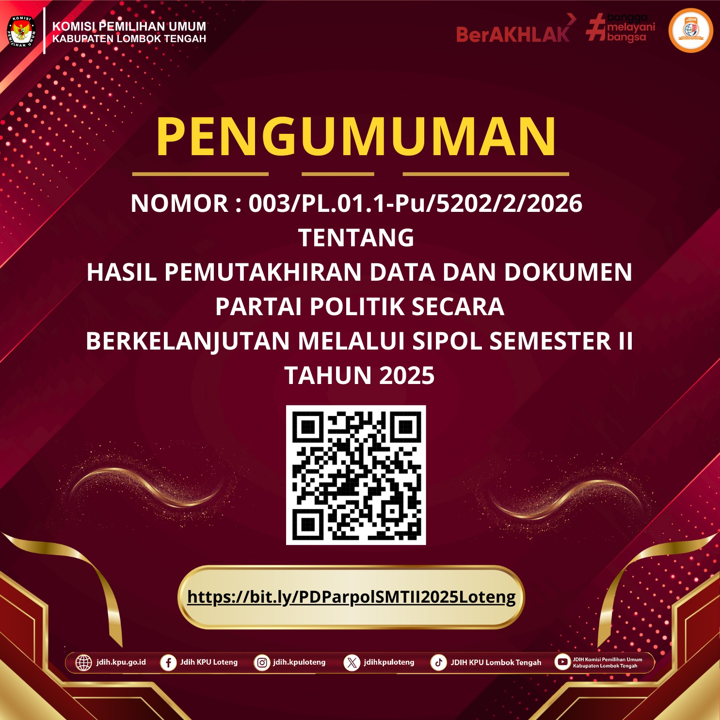Pengumuman Nomor:003/PL.01.1-Pu/5202/2/2026 Tentang Hasil Pemutakhiran Data dan Dokumen Partai Politik Secara Berkelanjutan Melalui SIPOL Sementer II Tahun 2025