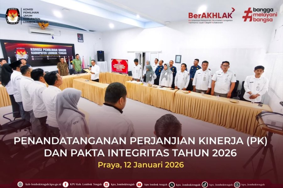 Senin (12/01/2026) KPU Kabupaten Lombok Tengah melaksanakan Kegiatan Penandatanganan Perjanjian Kerja (PK) dan Pakta Integritas Tahun 2026.