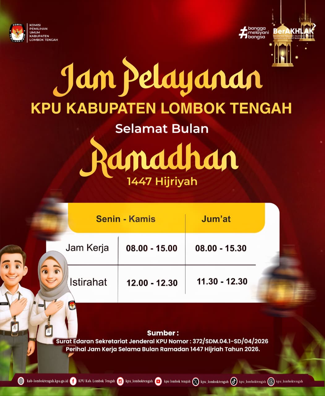 Berdasarkan Surat Edaran Sekretaris Jenderal KPU Nomor 372/SDM.04.1-SD/04/2026, terdapat penyesuaian jam pelayanan di KPU Kabupaten Lombok Tengah selama bulan Ramadhan 1447 Hijriah Tahun 2026.