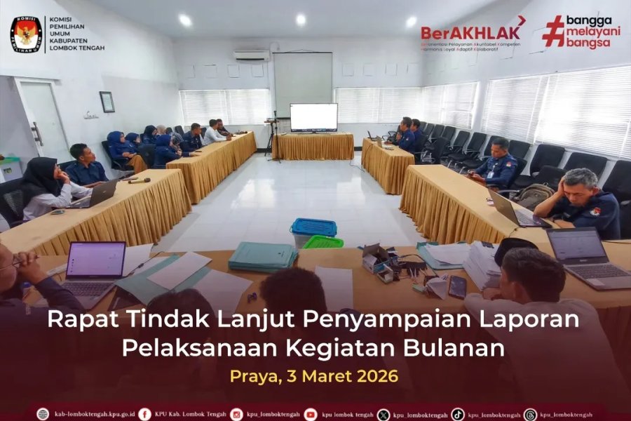 Menindaklanjuti Surat Dinas Sekretaris KPU Provinsi NTB Nomor 158/PR.06-SD/52/3/ 2026, diadakan Rapat Tindak Lanjut Penyampaian Laporan Pelaksanaan Kegiatan Bulanan, Selasa (03/03/2026).