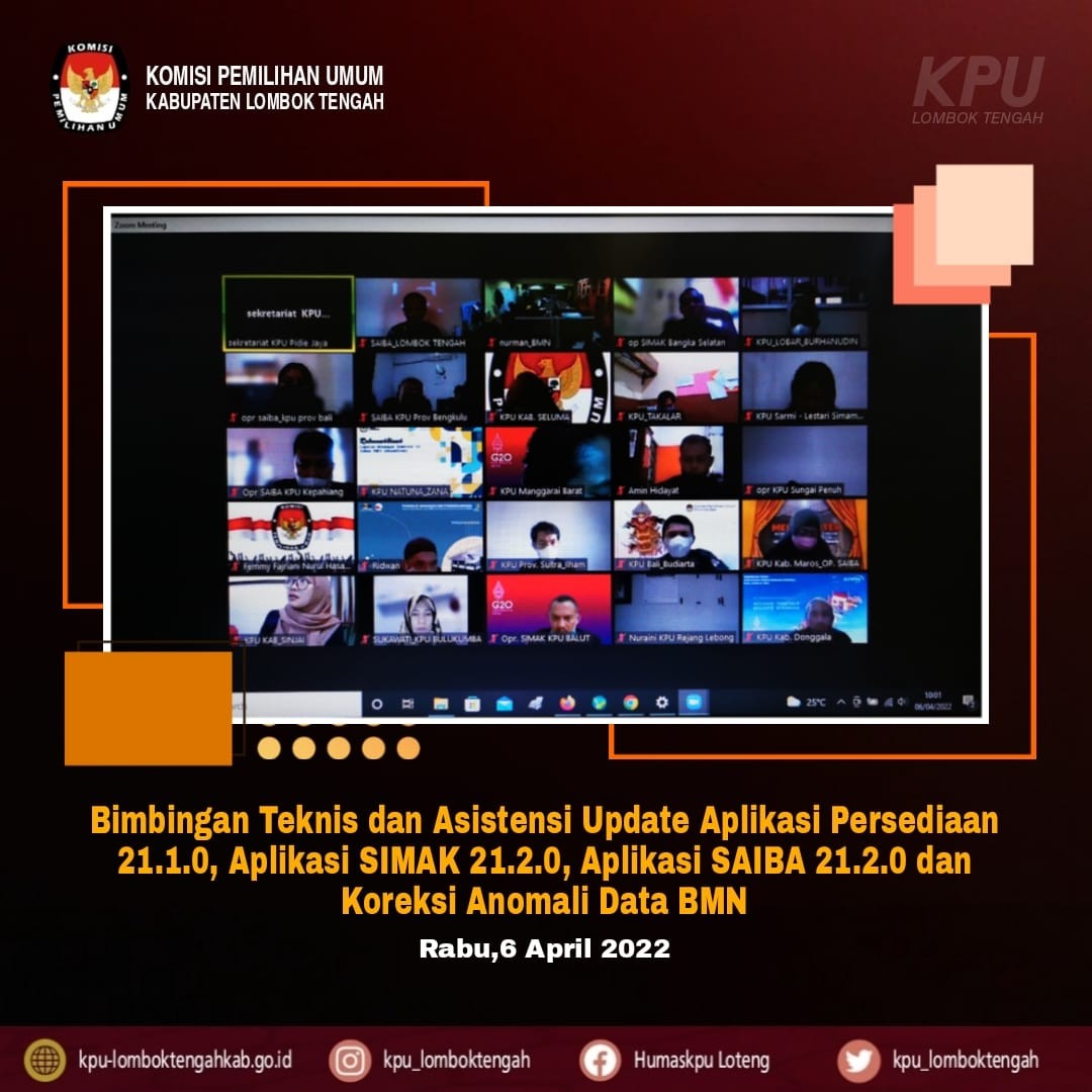 Rabu 6 April 2022, KPU Kab. Lombok Tengah mengikuti Bimtek dan Asistensi Update Aplikasi Persediaan 21.1.0, Aplikasi SIMAK 21.2.0, Aplikasi SAIBA 21.2.0 dan Koreksi Anomali Data BMN yang dilaksanakan via zoom meating, diikuti oleh Operator SAIBA dan SIMAK BMN
