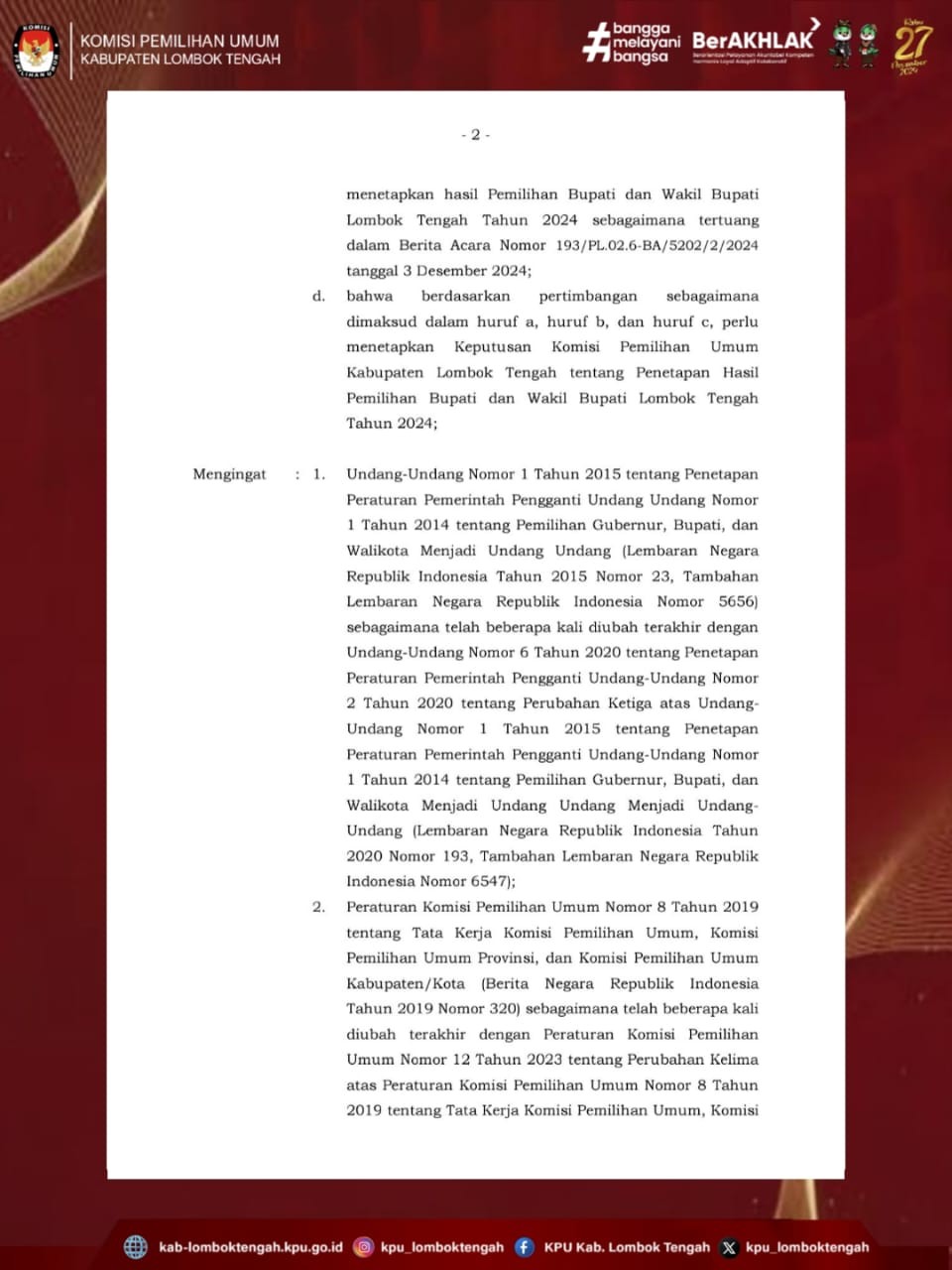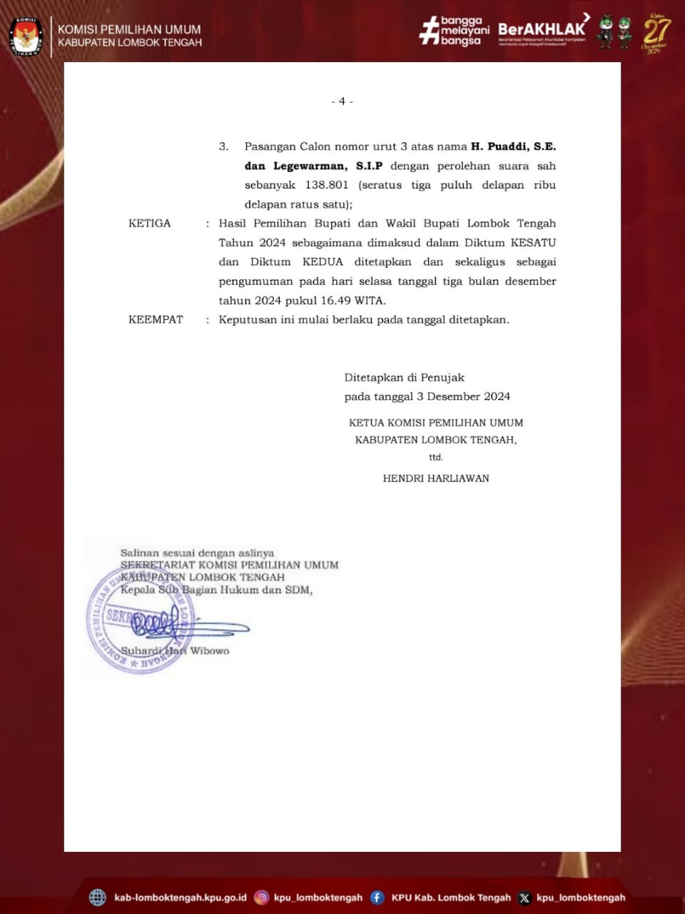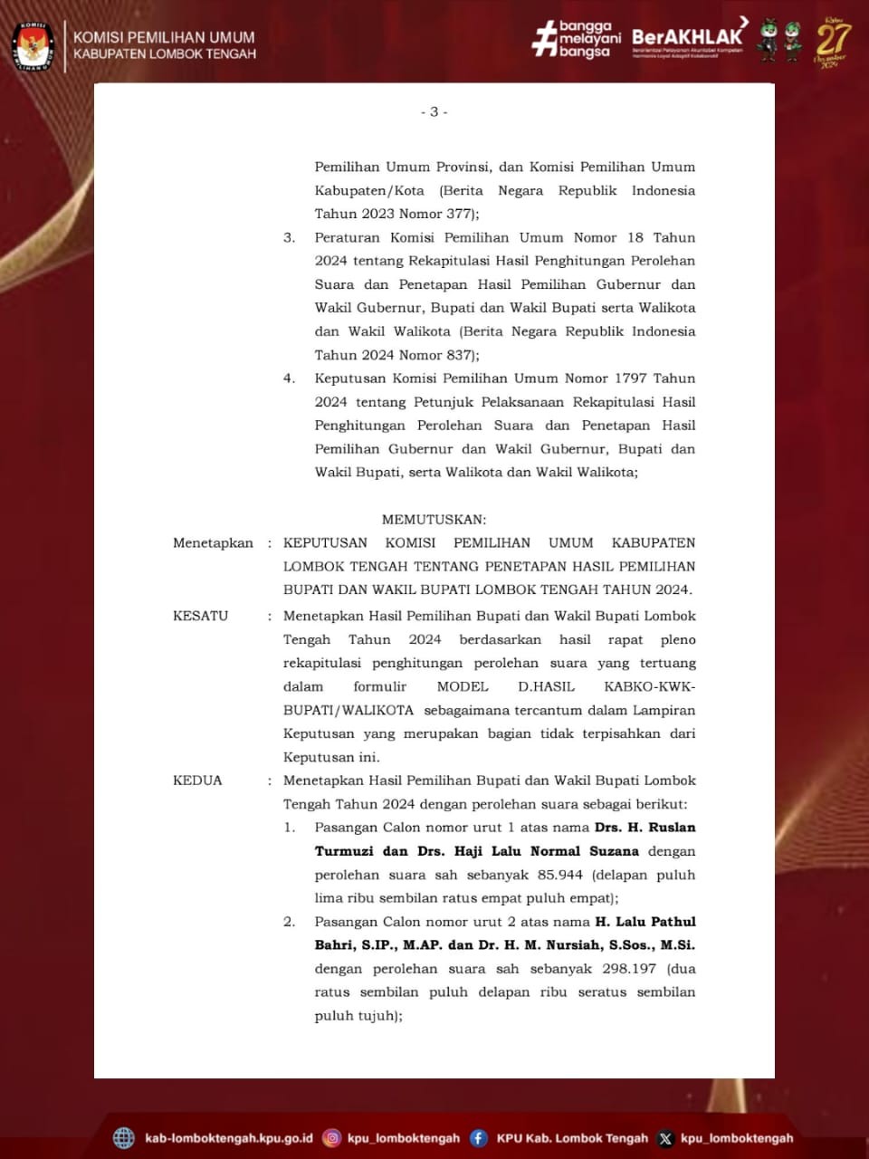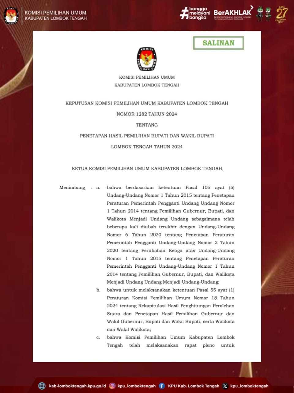 Keputusan Komisi Pemilihan Umum Kabupaten Lombok Tengah Nomor: 1282 Tahun 2024 Tentang Penetapan Hasil Pemilihan Bupati dan Wakil Bupati Lombok Tengah Tahun 2024
