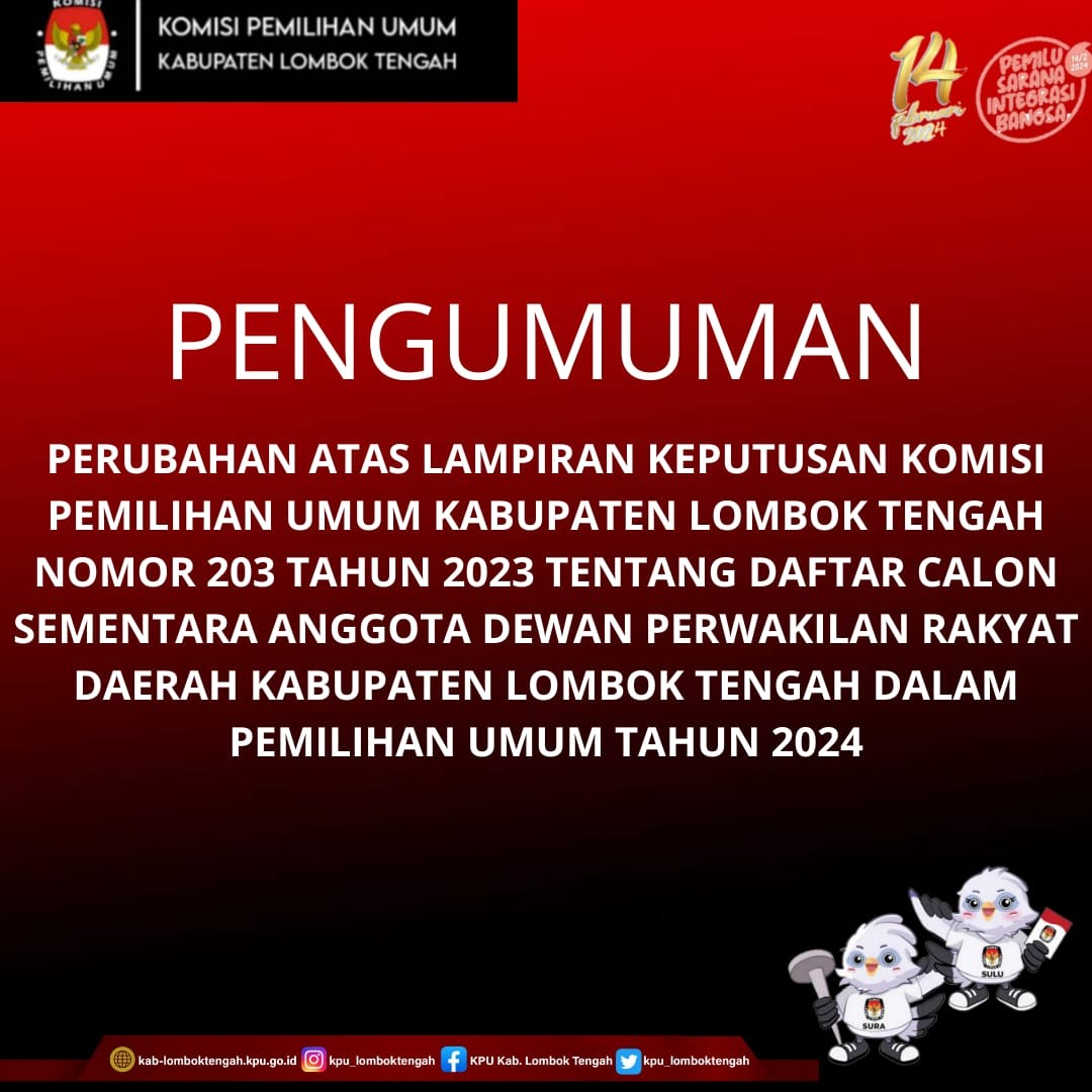 PERUBAHAN ATAS LAMPIRAN KEPUTUSAN KOMISI PEMILIHAN UMUM KABUPATEN LOMBOK TENGAH NOMOR 203 TAHUN 2023 TENTANG DAFTAR CALON SEMENTARA ANGGOTA DEWAN PERWAKILAN RAKYAT DAERAH KABUPATEN LOMBOK TENGAH DALAM PEMILIHAN UMUM TAHUN 2024