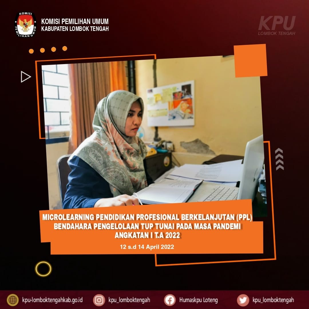 Selasa, 12 April 2022 Bendahara KPU Lombok Tengah mengikuti Microlearning Pendidikan Profesional Berkelanjutan (PPL) Bendahara Pengelolaan TUP Tunai Pada Masa Pandemi Angkatan I T.A 2022, yang diselenggarakan oleh Kementerian Keuangan Republik Indonesia Badan Pendidikan dan Pelatihan Keuangan