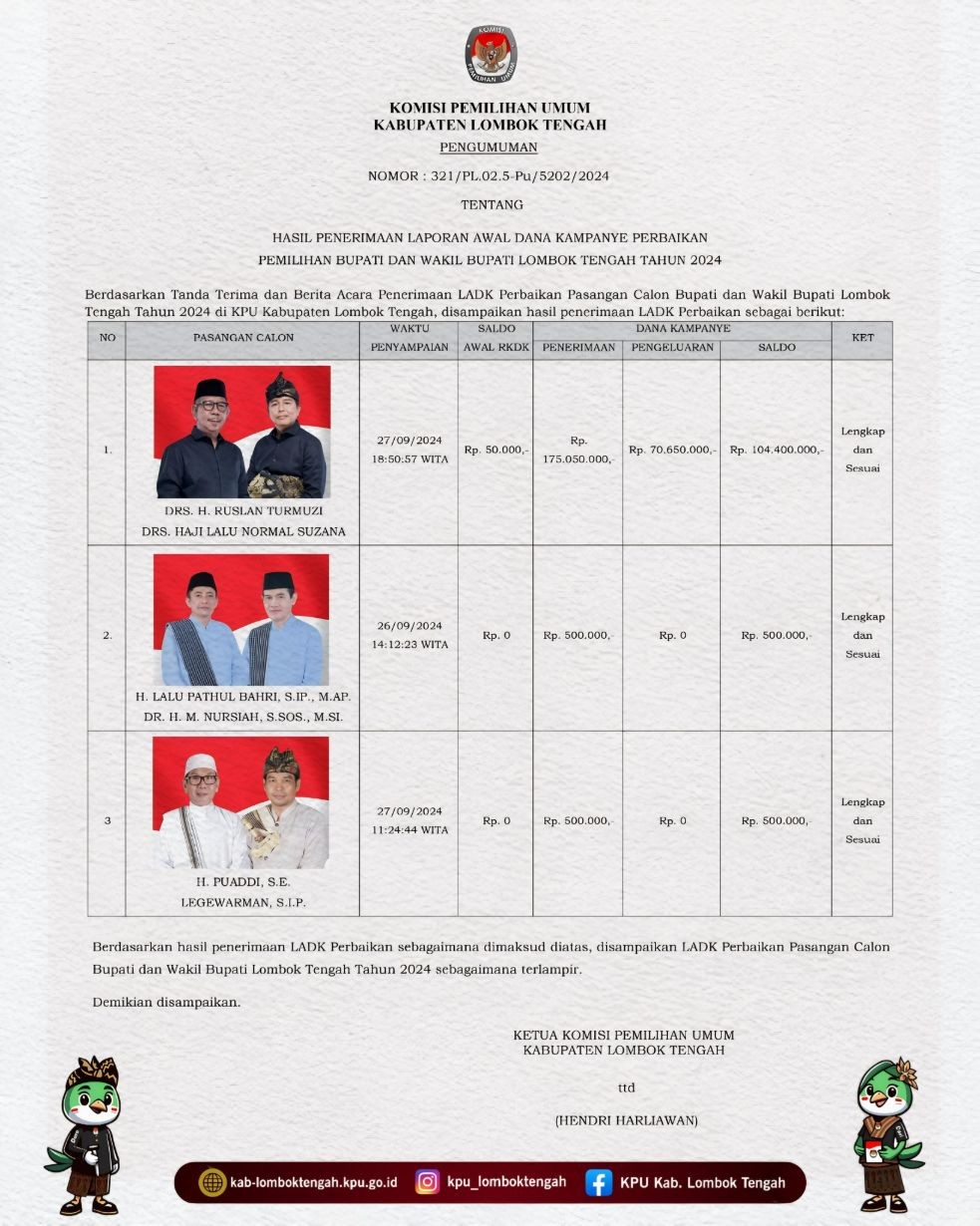 Pengumuman Hasil Penerimaan Laporan Awal Dana Kampanye Perbaikan Dalam Pemilihan Bupati dan Wakil Bupati Lombok Tengah 2024
