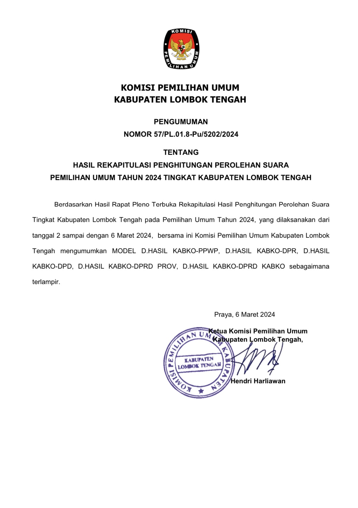PENGUMUMAN NOMOR 57/PL.01.8-Pu/5202/2024 TENTANG HASIL REKAPITULASI PENGHITUNGAN PEROLEHAN SUARA PEMILIHAN UMUM TAHUN 2024 TINGKAT KABUPATEN LOMBOK TENGAH