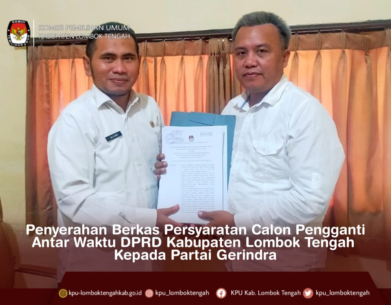 Kamis, 02 Juni 2022 Kasubbag Teknis dan Hupmas KPU Kab. Lombok Tengah telah menyerahankan berkas persyaratan Calon Pengganti Antarwaktu DPRD Kabupaten Lombok Tengah kepada Partai Gerindra