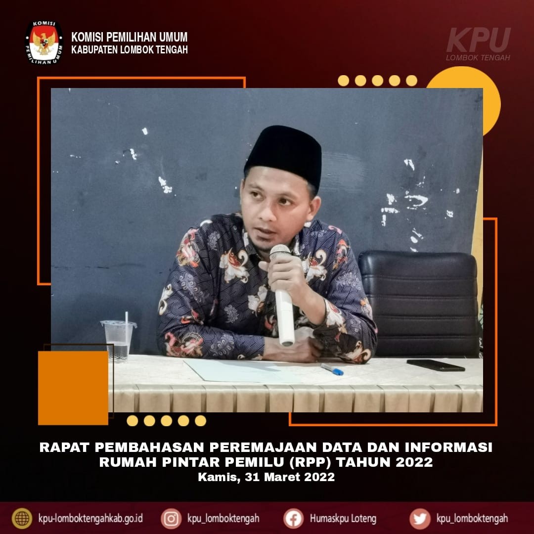 Kamis 31 Maret 2022, bertempat diruang Rapat KPU Kab Lombok Tengah, telah diaksanakan Rapat Pembahasan Peremajaan Data dan Informasi Rumah Pintar Pemilu ( RPP ) yang dihadiri oleh Ketua, Anggota KPU Kab. Lombok Tengah, Sekretaris, Pejabat Struktural dan Staf.