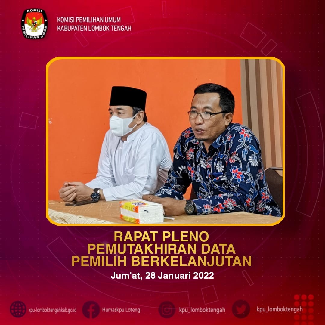 Adapun hasil dari berita acara Rapat Pleno Data Pemilih Berkelanjutan Bulan Januari 2022 dibacakan langsung oleh Ketua KPU Kab. Lombok Tengah dimana jumlah daftar pemilih berkelanjutan pada bulan januari sebanyak 763.989 ( Tujuh ratus enam puluh tiga ribu sembilan ratus delapan puluh sembilan ) pemilih. Dengan rincian pemilih laki-laki berjumlah 378.669 ( Tiga ratus tujuh puluh delapan ribu enam ratus enam puluh sembilan ) pemilih, dan pemilih perempuan berjumlah 385.320 ( Tiga ratus delapan puluh lima ribu tiga ratus dua puluh) pemilih, tersebar di 12 ( Dua belas ) kecamatan.