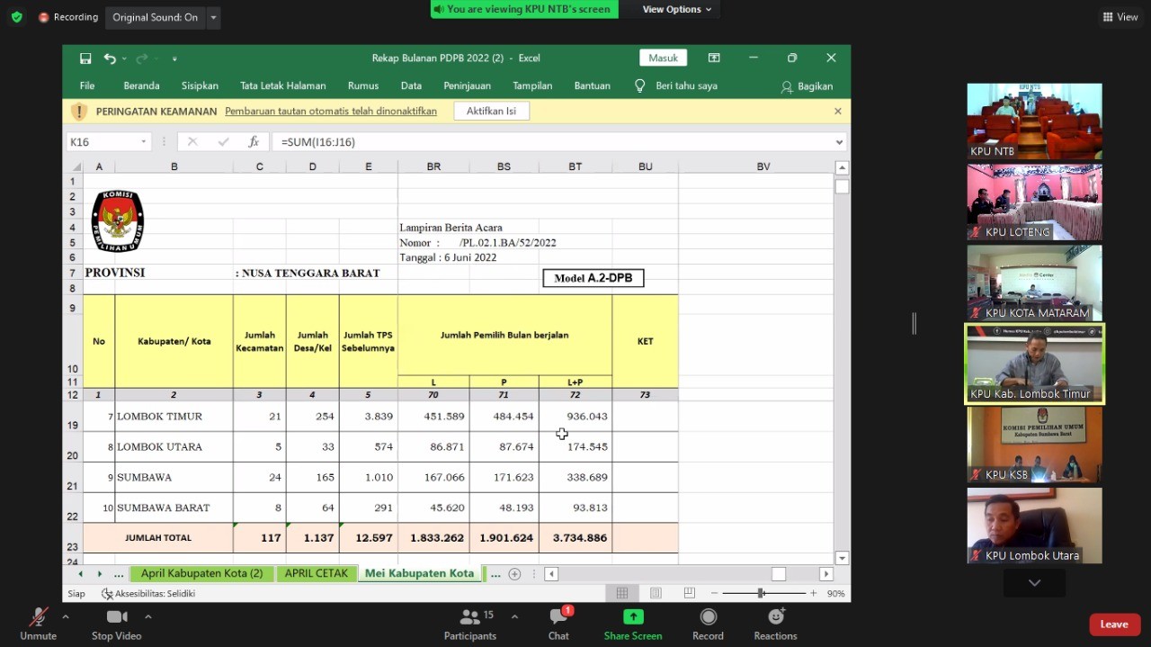 Selasa, 07 Juni 2022 KPU Kab. Lombok Tengah mengikuti Rapat Pleno Rekapitulasi Pemutakhiran Daftar Pemilih Berkelanjutan Periode Bulan Mei Tahun 2022 Tingkat Provinsi NTB, Rapat Pleno yang dilaksanakan melalui Zoom Meeting tersebut diikuti Anggota Divisi Perencanaan dan Data, Kasubbag Program, Data dan Informasi serta Operator masing - masing KPU Kabupaten/Kota se - NTB.