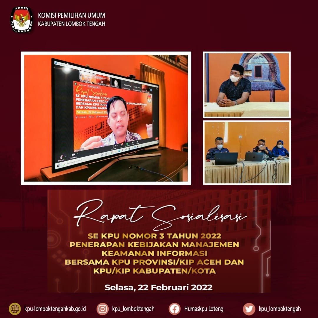 Rapat Koordinasi Sosialisasi Penerapan Kebijakan Manajemen Keamanan Informasi Selasa, 22 Februari 2022 sebagai tindak lanjut dari Surat Edaran Ketua Komisi Pemilihan Umum Nomor 3 Tahun 2022 Tentang Penerapan Kebijakan Manajemen Keamanan Informasi, bertempat di Media Center KPU Kab. Lombok Tengah telah dilaksanakan Rapat Koordinasi Sosialisasi Penerapan Kebijakan Manajemen Keamanan Informasi. Rapat dilaksanakan secara daring melalui zoom meeting oleh KPU RI dan diikuti Oleh KPU Provinsi dan KPU Kabupaten/Kota seluruh Indonesia. Hadir dalam Rapat dimaksud adalah Ketua Divisi Perencanaan Data dan Informasi Lukmanul Hakim, S.Pd.i, pejabat struktural dan staf Perencanaan Data dan Informasi KPU Kab. Lombok Tengah Maksud dan tujuan dari kegiatan ini adalah agar masing-masing satuan kerja mampu menerapkan informasi dan familiar dengan dunia cyber secara efektif, efiesien, dan konsisten serta bertujuan untuk memberikan standar kerja tentang bagaimana satuan kerja ( satker) harus mengelola informasi dan datanya.