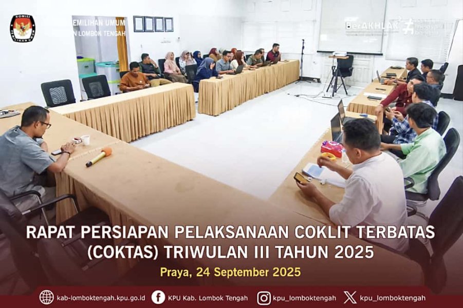 Rabu (24/09/2025) KPU Kabupaten Lombok Tengah mengadakan rapat internal persiapan pelaksanaan Coklit Terbatas (Coktas) Triwulan III Tahun 2025.