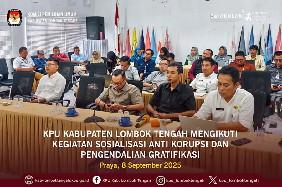 Senin (08/09/2025), KPU Kabupaten Lombok Tengah mengikuti kegiatan Sosialisasi Antikorupsi dan Pengendalian Gratifikasi pada KPU, KPU Provinsin/KIP Aceh, dan KPU/KIP Kabupaten Kota yang diselenggarakan oleh KPU RI secara daring melalui Zoom Meeting, dengan diikuti oleh seluruh satuan kerja KPU se-Indonesia.