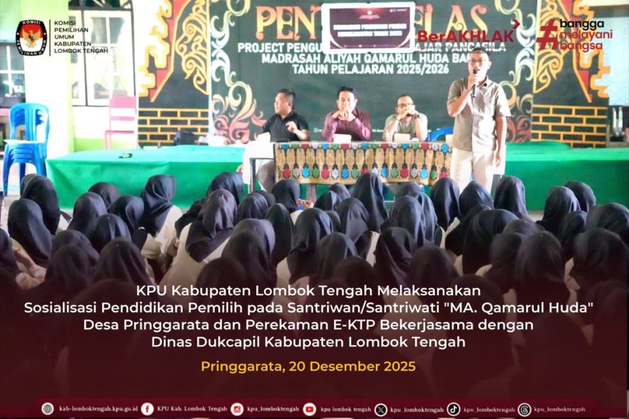#TemanPemilih Sabtu (20/12/2025) Bertempat di Madrasah Aliyah Qamarul Huda, Desa Bagu Kecamatan Pringgarata, KPU Kabupaten Lombok Tengah melaksanakan kegiatan Sosialisasi Pendidikan Pemilih yang dirangkaikan kegiatan perekaman E-KTP melalui kerja sama dengan Dinas Kependudukan dan Pencatatan Sipil Kabupaten Lombok Tengah kepada Santriwan dan Santriwati MA Qamarul Huda. Kegiatan diawali dengan sambutan dan arahan dari Ketua KPU Kabupaten Lombok Tengah yang menekankan pentingnya partisipasi pemilih. Selanjutnya, penyampaian materi oleh Ketua Divisi Perencanaan, Data dan Informasi KPU Kabupaten Lombok Tengah yang membahas peran pemilih, syarat menjadi pemilih, serta pentingnya terdaftar dalam data pemilih. Setelah rangkaian sosialisasi selesai, kegiatan dilanjutkan dengan perekaman KTP elektronik bagi santri yang telah memenuhi syarat usia 17 tahun, dengan difasilitasi oleh petugas dari Dinas Dukcapil. Melalui kegiatan ini diharapkan para santri memiliki pemahaman yang lebih baik mengenai kepemiluan sehingga kedepan mampu berpartisipasi aktif sebagai pemilih cerdas dan bertanggung jawab pada pemilu dan pemilihan yang akan datang serta terpenuhinya kewajiban administrasi kependudukan bagi santri yang telah memenuhi syarat. #KPUMelayani #KPULoteng